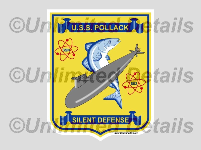 Our exclusive USS Pollack (SSN 603) decal measures 4.25" wide by 5.25" high. We use our own insignia artwork to guarantee the ultimate in sharpness and color brilliance. Our laser cutting also trims each sticker perfectly so, you can put away the scissors.