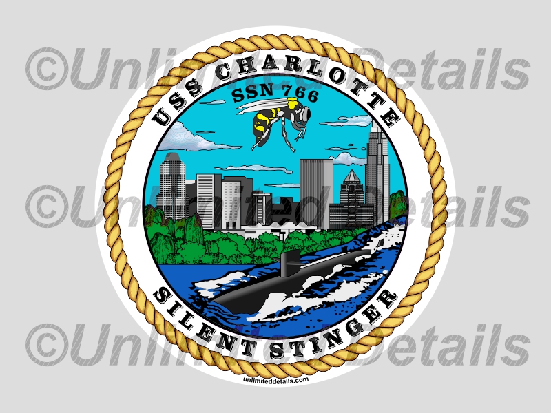 Our exclusive USS Charlotte (SSN 766) decal measures 5.25" wide by 5.25" high. We use our own insignia artwork to guarantee the ultimate in sharpness and color brilliance. Our laser cutting also trims each sticker perfectly so, you can put away the scissors.