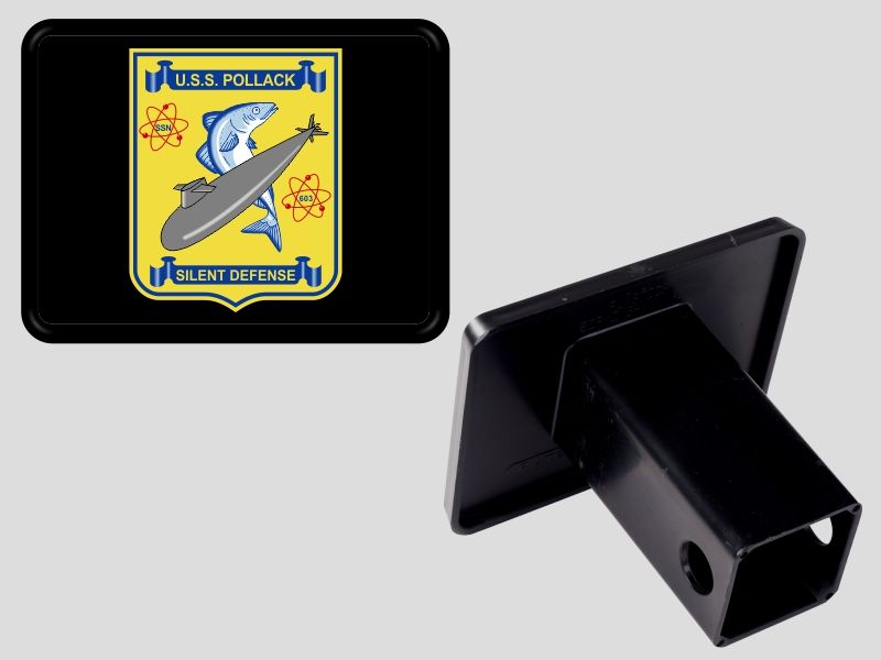 Our exclusive USS Pollack (SSN 603) Insignia Trailer Hitch Covers are crisp, full of color and are sure to dress up your ride. The rectangular cover fits a 2" receiver and has a 4.5" x 3.5" full color metal insert. A hitch pin (not included) is required to secure the cover in place.