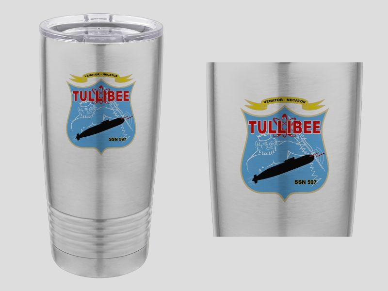 Our 20 ounce USS Tullibee (SSN-597) Insignia Travel Mug is sure to float your boat. Double wall, vacuum insulated with a clear sliding lid. These mugs are double the heat & cold resistance of a normal travel mug and have a narrow bottom to fit most vehicle cup holders.
