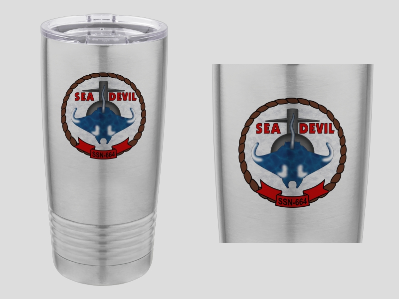 Our 20 ounce USS Sea Devil (SSN-664) Insignia Travel Mug is sure to float your boat. Double wall, vacuum insulated with a clear sliding lid. These mugs are double the heat & cold resistance of a normal travel mug and have a narrow bottom to fit most vehicle cup holders.
