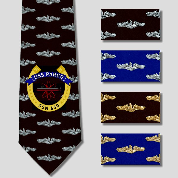 With our exclusive USS Pargo (SSN 650) Neck Tie, you can dress for a special occasion and still show your submarine pride. Each tie is 56" in length and printed fully from end to end. They are made from hand-sewn polyester satin and have a very smooth feel. The colors and images are sharp, crisp and brilliant. Available in both a black background or blue background with your choice of either silver or gold dolphins.