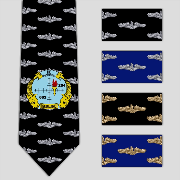With our exclusive USS Gurnard (SSN 662) Neck Tie, you can dress for a special occasion and still show your submarine pride. Each tie is 56" in length and printed fully from end to end. They are made from hand-sewn polyester satin and have a very smooth feel. The colors and images are sharp, crisp and brilliant. Available in both a black background or blue background with your choice of either silver or gold dolphins.