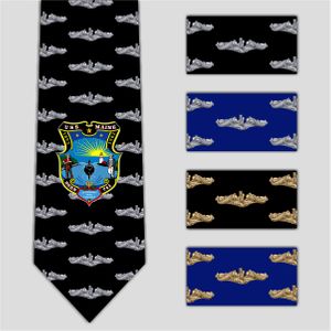 With our exclusive USS Maine (SSBN 741) Neck Tie, you can dress for a special occasion and still show your submarine pride. Each tie is 56" in length and printed fully from end to end. They are made from hand-sewn polyester satin and have a very smooth feel. The colors and images are sharp, crisp and brilliant. Available in both a black background or blue background with your choice of either silver or gold dolphins.